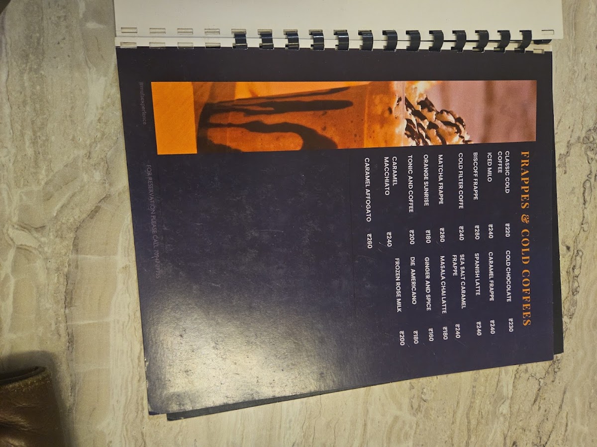 Frappes & Cold Coffees encompass Classic Cold Coffee, Cold Chocolate, Iced Milo, Caramel Frappe, Biscoff Frappe, Spanish Latte, Cold Filter Coffee, Sea Salt Caramel Frappe, Matcha Frappe, Masala Chai Latte, Orange Sunrise, Ginger and Spice, Tonic and Coffee, Die Americano, and Caramel Affogato, offering a range of chilled and flavored coffee drinks suitable for various tastes.